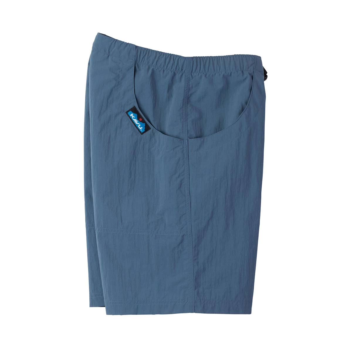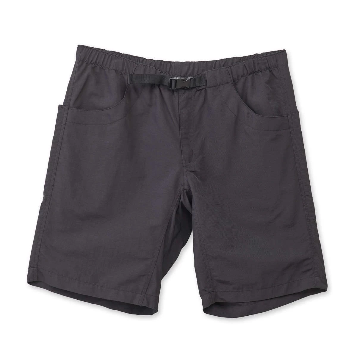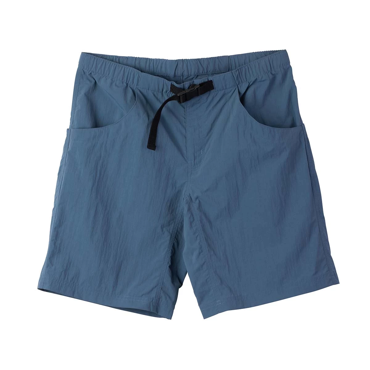 Loose fit, elastic waist short with rubberized snap and zip fly, built in ¾” nylon webbing belt with side release buckle, half-moon pockets with right rear internal wallet stay, mesh pocket bags, gusset, double needle seams.