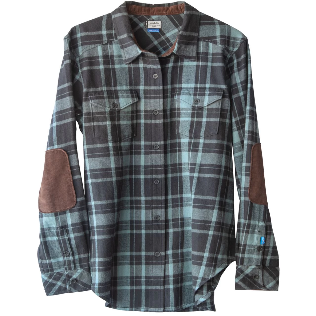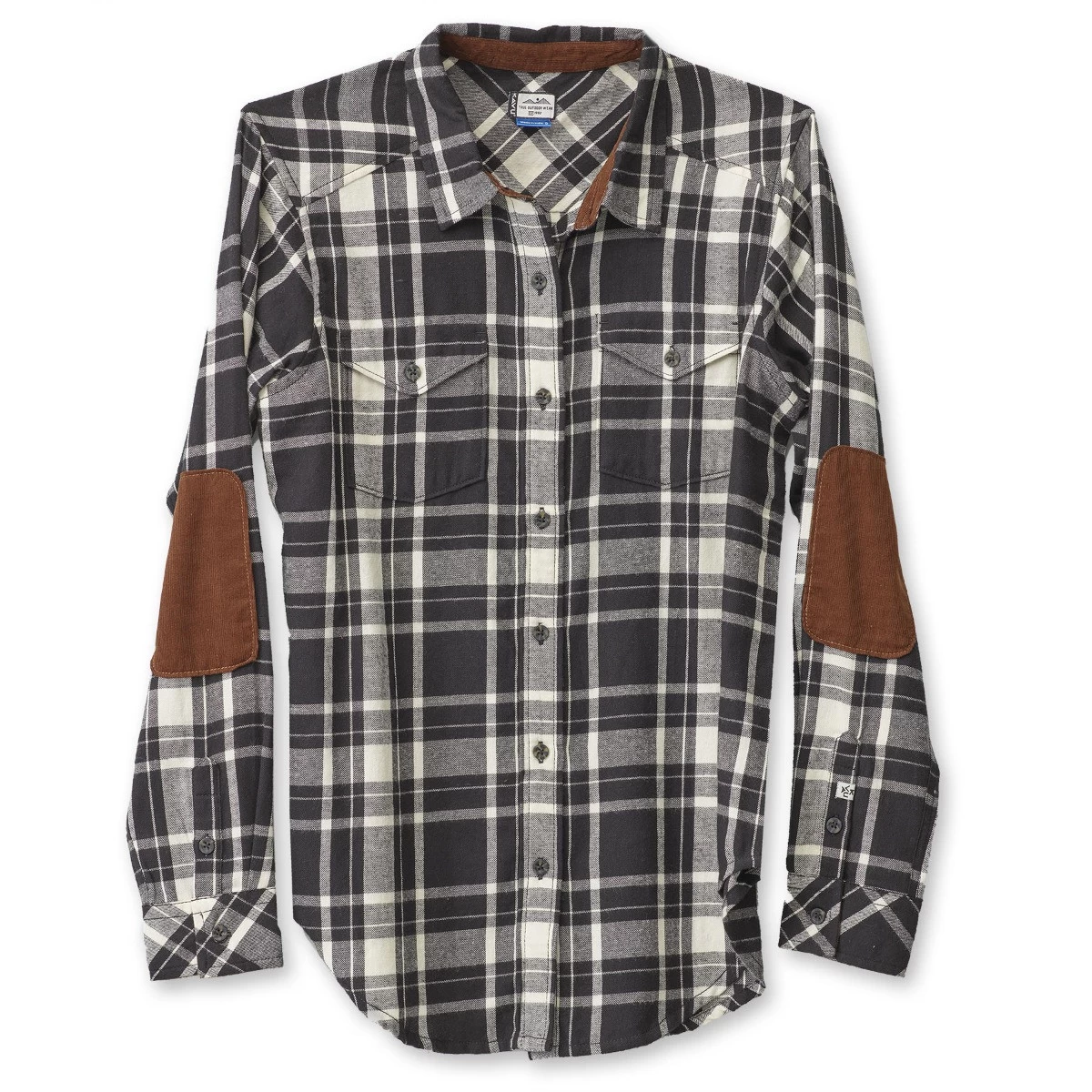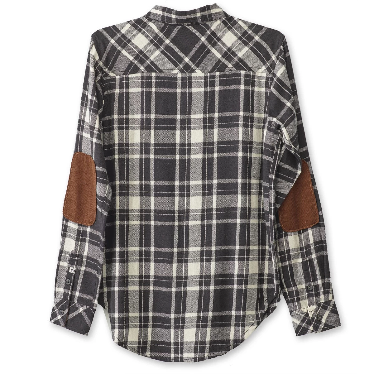 Boyfriend fit, long sleeve button up shirt, stand collar, two chest flap pockets, corduroy elbow patches, deep curved hem.
