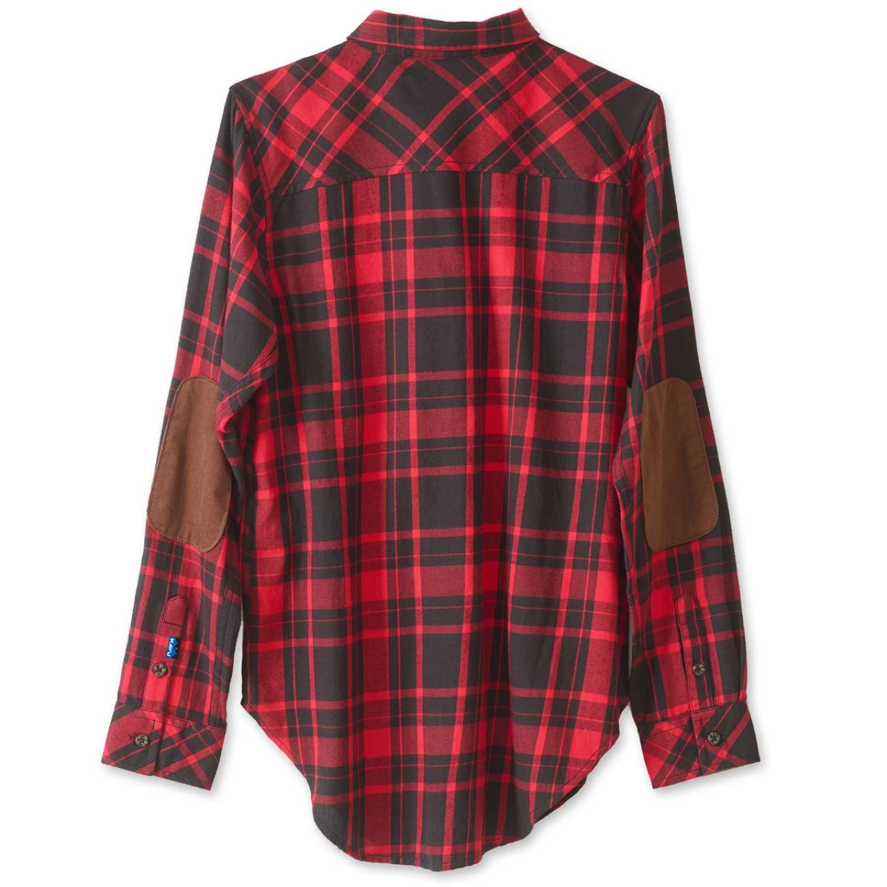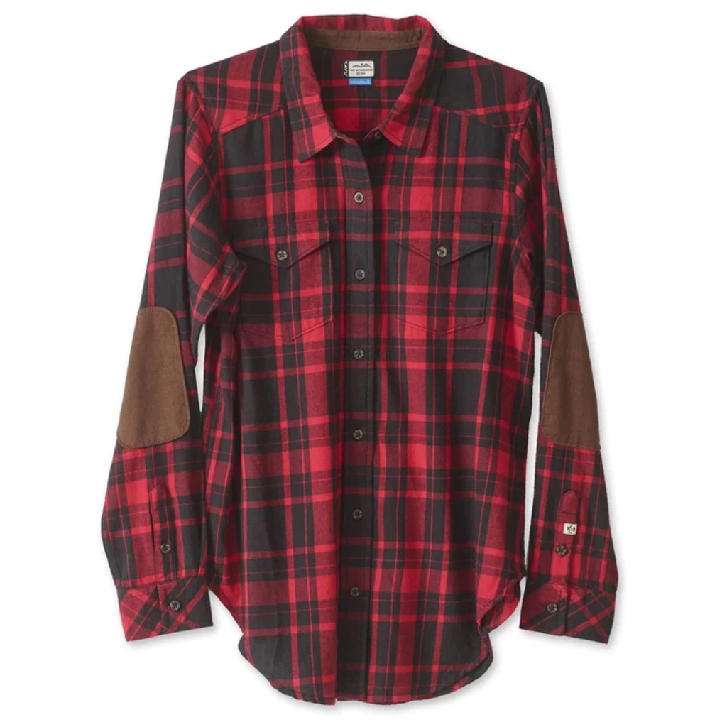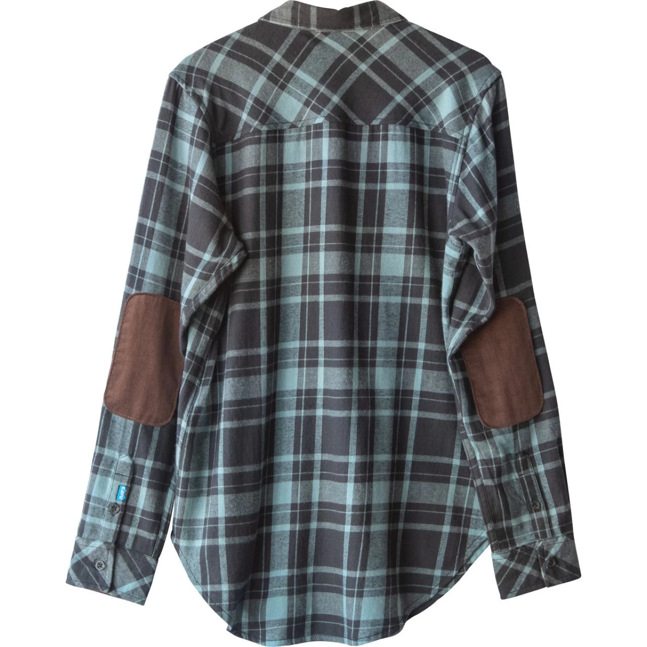 Boyfriend fit, long sleeve button up shirt, stand collar, two chest flap pockets, corduroy elbow patches, deep curved hem.