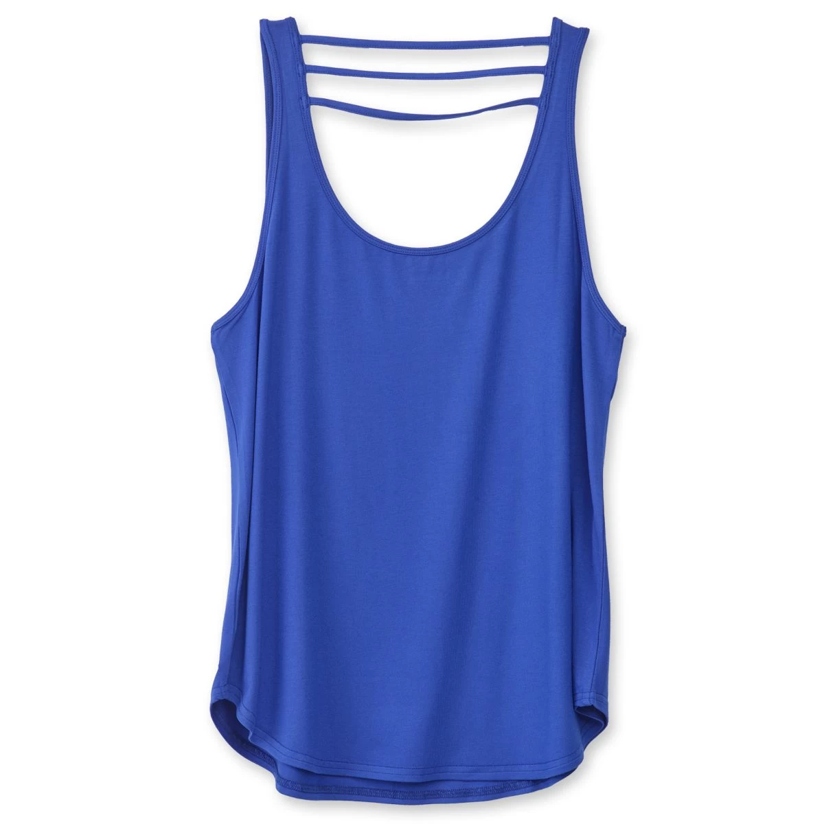 Free flow’n tank top, scoop neck, stylized back strap detail, curved hem.