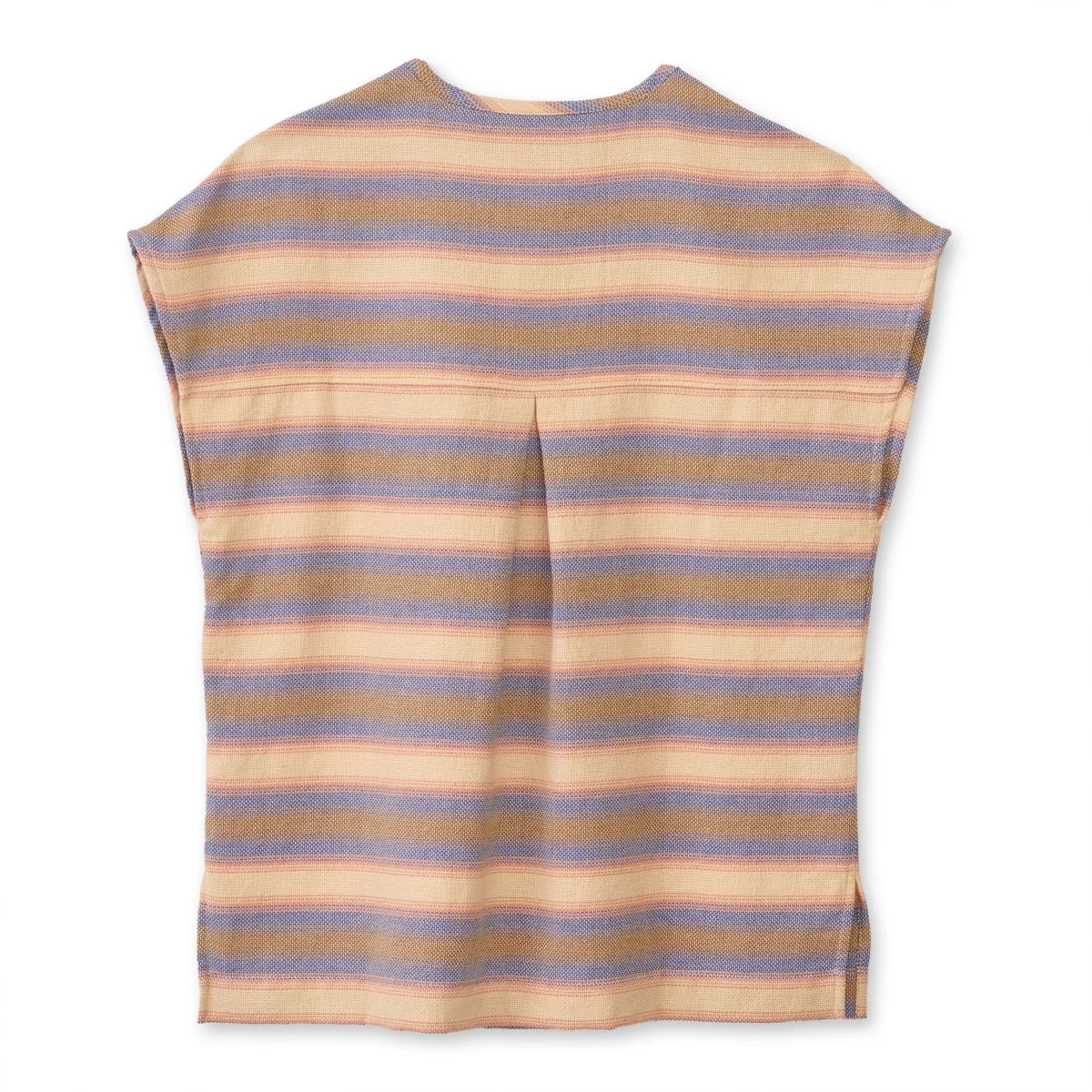 Relaxed fit, sleeveless popover shirt, v-neckline, front and back pleat detail, straight hem with side slits.