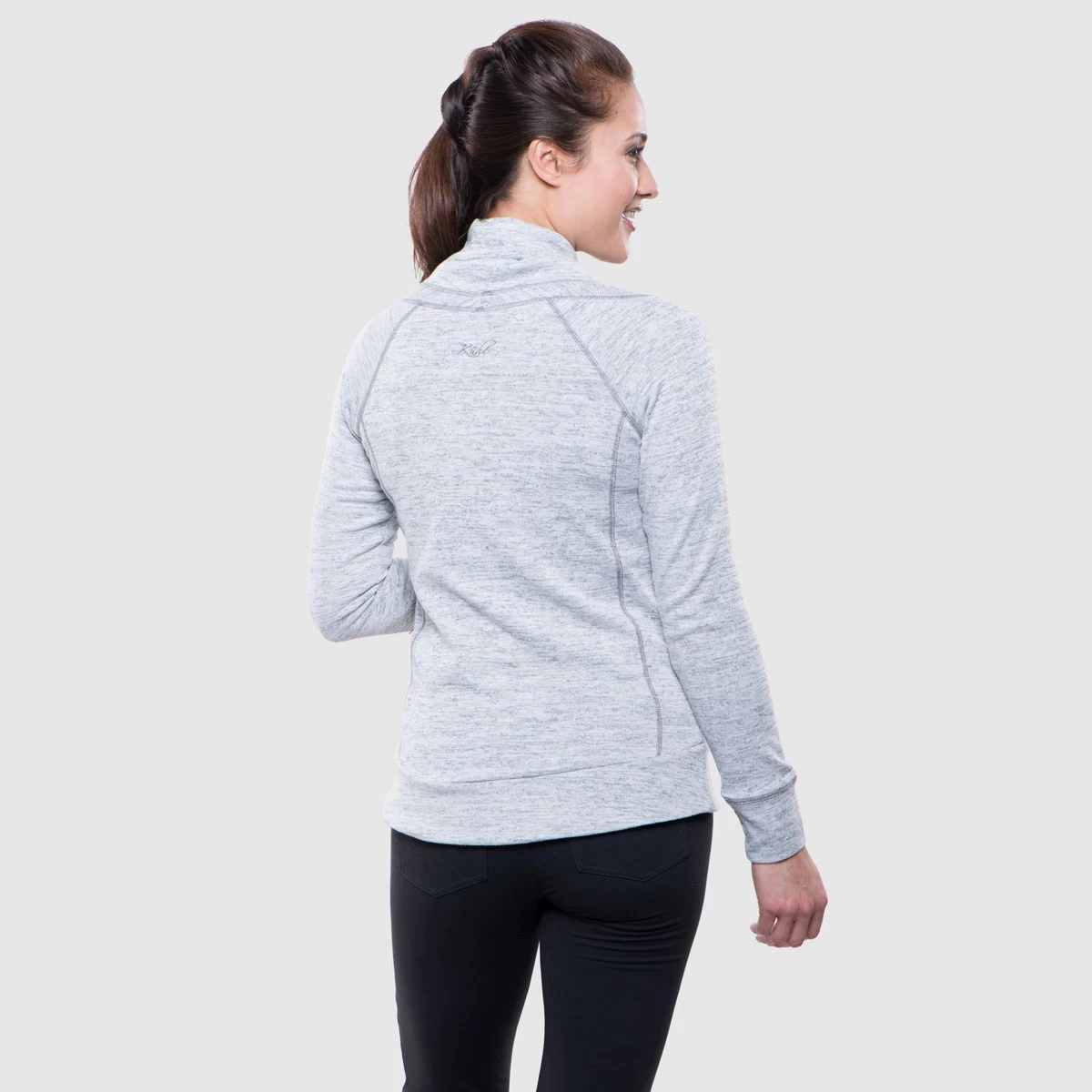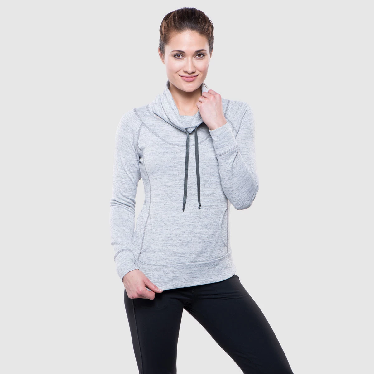 The Kuhl Lea Pullover features a soft, heathered polyester/spandex blend. This lightweight fabric combines the warmth and wicking properties of polyester with the stretch and movement of spandex. Sewn with DYNAMIK™ stitching for more stretch and strength than traditional flatlock, low bulk seams make layering comfortable and easy. Kuhl’s signature thumb loops keep your hands warm. Featuring a cowl neck with draw cord, kangaroo pocket, and princess lines for a flattering, feminine fit, this stylish pullover easily transitions from trail to town.