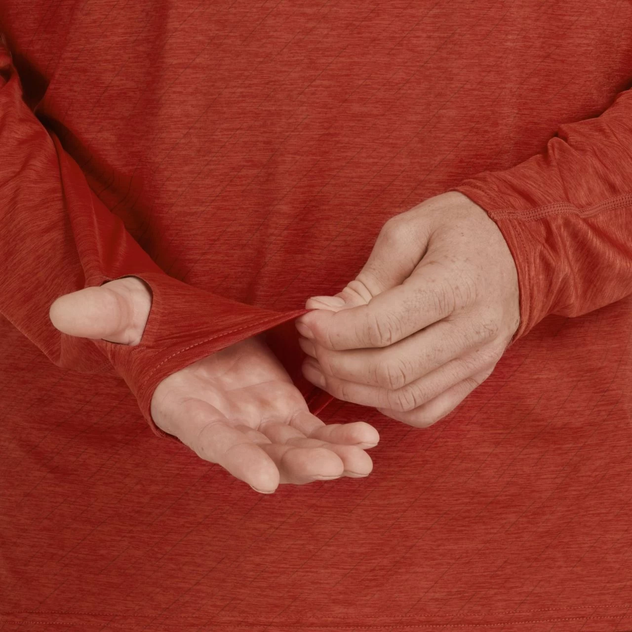 - Laser-cut thumbholes extend sun protection to the tops of your hands without adding unnecessary bulk to the cuffs.